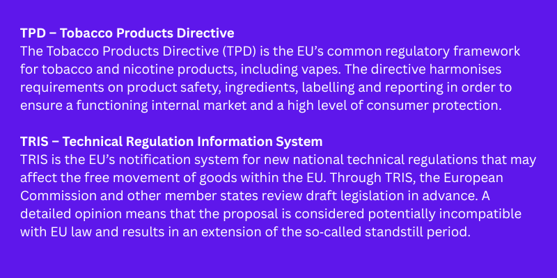 Via the EU’s TRIS system, the Commission has issued a so‑called detailed opinion after Austria submitted a draft law that not only bans disposable vapes but also extends ingredient restrictions to nicotine‑free e‑liquids. The problem? The EU already has harmonised rules for vaping products under the Tobacco Products Directive (TPD).
