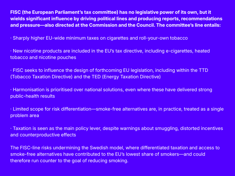 The European Parliament’s tax committee, FISC, is pushing for sharply higher and harmonised minimum taxes on all tobacco and nicotine products, including smoke-free alternatives such as nicotine pouches. The committee has no legislative power of its own, but it wields significant influence by driving political lines and through reports, recommendations and pressure—also directed at the Commission and the Council. In this way, it seeks to shape EU legislation, including within the TTD and the TED.